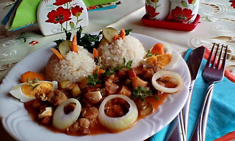 Keď bolo mäso mäkké, pridala som nakrájané uhorky a vajcia a už iba pomiešala všetko a vypla som sporák. Teraz som pridala čerstvú majoránku. Krok 4: Jedlo som podávala s ryžou.