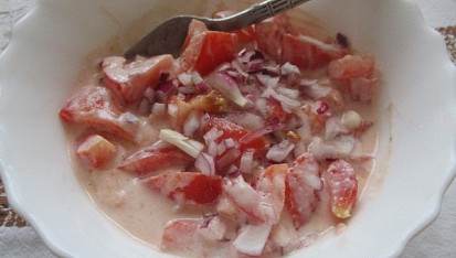 Krok 1: Rajčata nakrájíme na kostky, cibuli velmi nadrobno. Ve větší misce smícháme rajčata, cibuli, dochutíme solí a koriandrem dle vlastní chuti a přimícháme jogurt. Zakápneme citrónovou šťávou.