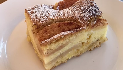 Krok 4: Těsto rozetřeme do pekáčku, poklademe kousky nakrájených jablek a pokapeme rozpuštěným tukem. Posypeme skořicovým cukrem a dáme péci do předem vyhřáté trouby na 170°C na 40 minut. Necháme vychladnout a nakrájíme. Nakonec posypeme moučkovým cukrem.