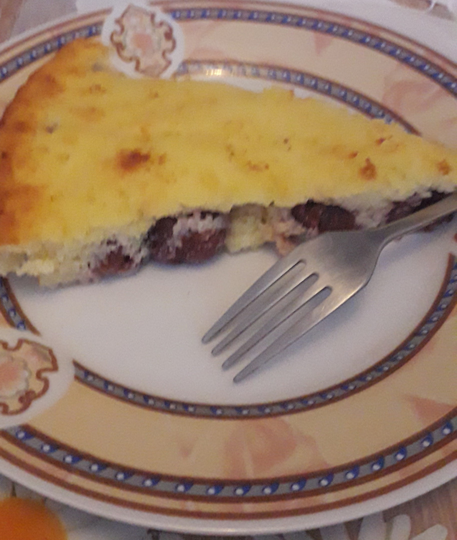 Krok 2: Těsto nalijeme do kulaté formy a navrch dáme višně nebo jiné ovoce.