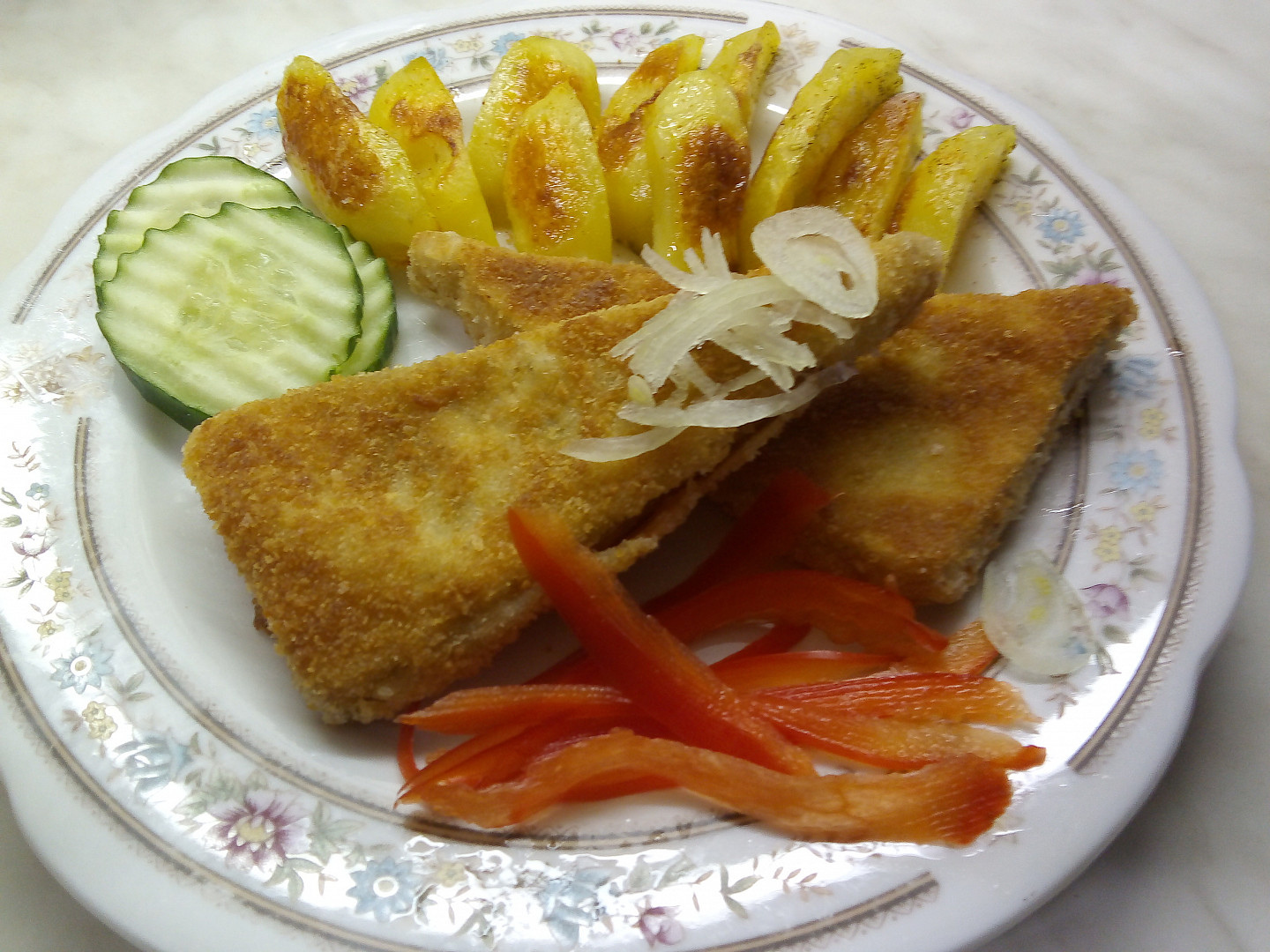 Krok 1: Tofu překrojíme šikmo na dva kousky a pak každý kousek v půlce. Posypeme ho tymiánem a obalíme v mouce, rošlehaných vejcích a strouhance. Opečeme na oleji a dáme odsát na papírovou utěrku.