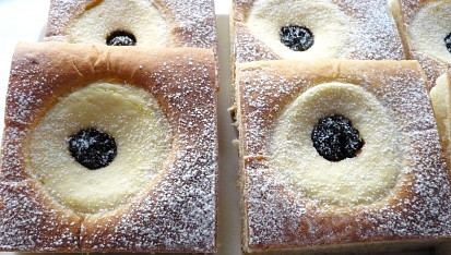 Povidla rozmícháme a pokud je třeba, upravíme hustotu. Buď zředíme troškou rumu nebo zahustíme strouhaným perníkem. Krok 3: Vykynuté těsto na vále rozválíme do obdélníkového tvaru o velikosti použitého plechu, do kterého vložíme papír na pečení. Místo papíru na pečení můžeme plech vymazat tukem, nejraději nějakým v kostce, těsto pak neklouže. Těsto na plechu ještě případně upravíme jednoručním vyvalovacím válečkem. Pak plech s těstem přikryjeme utěrkou a necháme vykynout. Množství těsta je určeno na plech o rozměrech cca 37 x 28 cm. Krok 4: Do vykynutého těsta vytlačíme pomoučeným rovným dnem skleničky nebo pevnějším kelímkem o průměru 55 mm dvanáct prohlubní. Vždy silně zatlačíme až dospodu a snažíme se mít důlky rovnoměrně v řadě, kvůli pozdějšímu krájení. Důlky ihned naplníme tvarohem, nejlépe to jde cukrářským sáčkem s rovnou špičkou. Doprostřed ještě přidáme trošku povidel. (Můžeme nakonec i posypat drobenkou.) Krok 5: Po naplnění vložíme do předehřáté trouby a upečeme. Orientačně 35 minut při 175-180 °C.