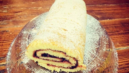 Krok 4: Upečený, ještě vlahý piškot vyklopíme na navlhčenou utěrku, potřeme marmeládou a stočíme.