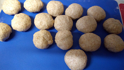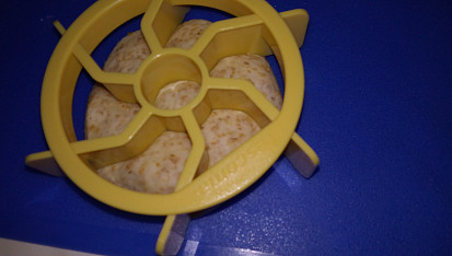 Krok 2: Z těsta uděláme malé bochánky, trochu je zmáčkneme, formičkou do 3/4 promáčkneme vzor, dáme na plech s pečícím papírem a necháme 15 minut ještě vykynout. Potom je potřeme mlékem (nebo vejcem), posypeme hrubozrnnou solí a sezamem a dáme do trouby předem vyhřáté na 200°C na 15-20 minut.
