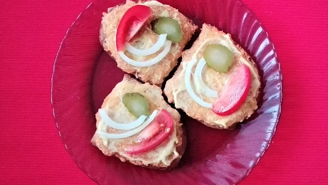 Krok 6: Hotové topinky potřeme hořčicí a ozdobíme okurkou, rajčetem a cibulí.
