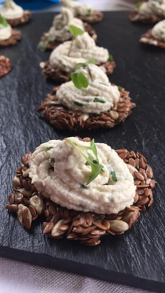 Namočte zároveň zvlášť kešu ořechy do vody na min 2-3 hod. Krok 2: Kešu ořechy pak trochou vody a irským mechem rozmixujte na krémovou hmotu. přidejte probiotika (1-2 kapsle) a dejte do misky, kterou zakryjte a nechte to druhého dne fermentovat (min 12 hod). Krok 3: Směs namočených semínek dochutíte bylinkami a kořením dle sebe, možno i přidat jemné nakrájenou jarní cibulku či česnek, dle vlastní chuti. Na plech dejte pečicí papír a na něj dělejte tenčí placky. Můžete použít formičku, aby byla stejná a pak sušte v malinko pootevřené troubě na 50ti stupních. Pokud chcete mít krekry hotové rychleji, zvyšte teplotu na 100 stupňů a sušte. Krok 4: Druhý den fermentovanou směs z kešu a irského mechu dochutíte olivovým olejem, citronem, solí či lahůdkovým droždím a přidáte jemně nakrájenou pažitku. Sýrem pak můžete zdobit vaše krekry a navrch můžete posypat bylinkami.