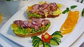 Krok 4: Servírujeme na krajíci chleba se salátem a zdobíme cibulí, kapií a okurkou, nebo čímkoliv co máme rádi.