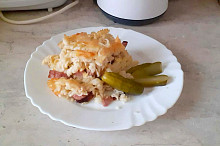 Zapečené těstoviny se salámem, sýrem a vajíčkem
