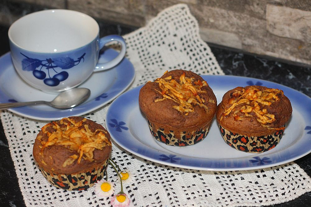 Plech na muffiny vyložíme papírovými košíčky a těsto rovnoměrně rozdělíme do košíčků. Krok 2: Oloupaná jablka nastrouháme na hrubé slzy, vmícháme do nich lžičku skořice a vanilkový cukr.