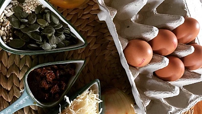 Krok 3: Do vychladlé směsi přidáme žloutky, sýr a semínka a dobře promícháme.