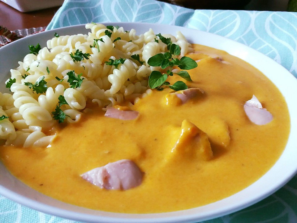 mrkvová omáčka na smetaně s s kuřecím masem,