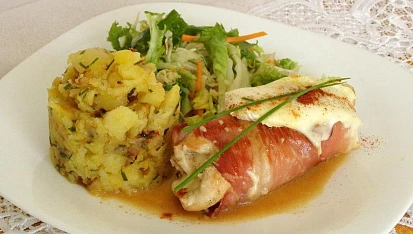 Kuřecí prso obalené Schwarzwaldskou šunkou, s Hermelínem a šťouchané brambory s česnekem