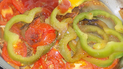 Krok 2: Přiklopíme pokličkou a necháme dusit, až pustí šťávu, přidáme rajčata nakrájená na 5 mm kolečka, dusíme cca 20 minut.