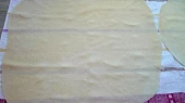 Krok 3: Vyválené placky položíme na čisté utěrky a necháme schnout. Během této doby je obracíme, aby všude stejně oschly. Musí ale ještě zůstat trochu vláčné, aby se daly nakrájet, ale nesmí už lepit.