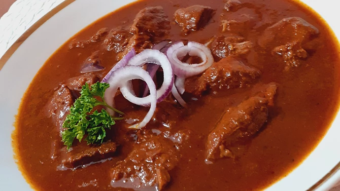 Krok 6: Guláš podáváme buď nezahuštěný, nebo zahuštěný chlebem, případně moukou rozmíchanou v malém množství studené vody.