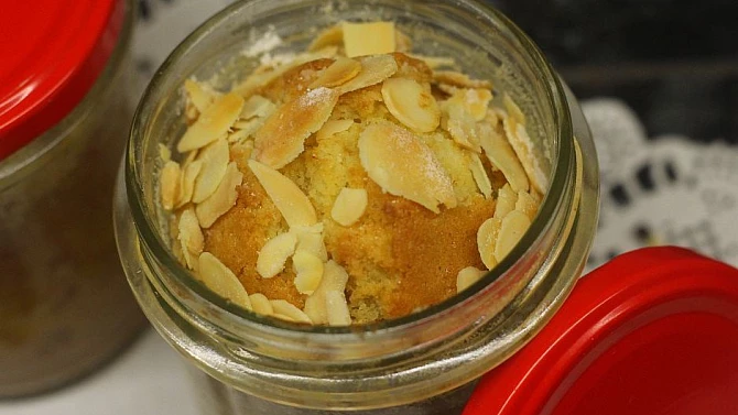 Po 20 minutách plech vytáhneme z trouby, mandlové lupínky rozdělíme navrch skleniček a plech vrátíme ještě na 15 minut do trouby. Krok 8: Když jsou koláčky upečené, plech vyndáme z trouby a každou skleničku ihned uzavřeme víčkem. Necháme vychladnout a uchováme v chladu.