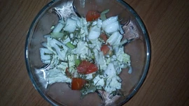 Krok 1: Omyté čínské zelí nakrájíme na tenké nudličky, které ještě rozkrájíme na menší kousky. Rajčata omyjeme podélně rozkrojíme, vyřízneme tvrdou část od stopky a nakrájíme na kousky. Cibulku nakrájíme na kolečka a přidáme kopr.