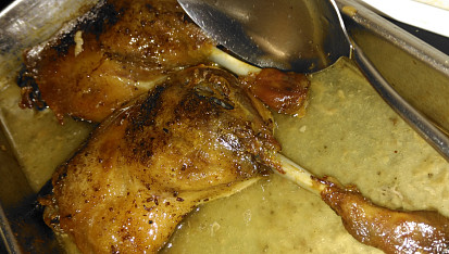 Pečená kachní stehna se špenátem a česnekovými brambory