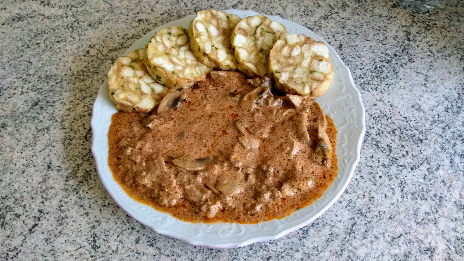 Krok 3: Obsah pánve přendáme do rendlíku odpovídající velikosti, zalijeme oběma smetanami, vsypeme připravené žampiony a na požadovanou hustotu naředíme plnotučným mlékem, ale ne příliš. Žampiony vařením změknou a tím omáčka sama zřídne. Nakonec přidáme máslo, bylinky a necháme už jen přejít varem. Dochutíme, je-li třeba.