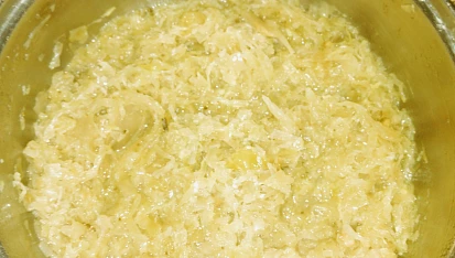 Ze zelí odstraníme šťávu, ale nevyléváme ji! (Ze sáčku kupovaného zelí ustřihnu růžek a zelnou vodu sliji do hrnečku a sáček ještě vymačkám.) Vymačkané zelí pak překrájím. Na sádle (oleji) rozpustíme špek, kterého nemusí být moc, je tam hlavně pro vůni. Na horký tuk dáme osmahnout cibulku, stačí do sklovita. Přidám zelí, podliji trochu vodou a okmínuji. Nechám přejít varem a ochutnám, co zelí potřebuje – podle toho dochucuji cukrem a špetkou soli. Pokud je potřeba, okyselím slitou zelnou vodou nebo i octem. (Když mi zbyde zelná voda, malinko ji zředím vodou a vypiji, je to hodně zdravé.) Zelí dusím pod pokličkou doměkka, hlídám, aby se nepřipálilo – podle potřeby podlévám. Nakonec nastrouhám na jemných slzičkách neoloupané jablko, přidám k vydušenému zelí a tím ho zahustím. Zelí tak získá ještě lepší chuť a vůni. Krok 3: Knedlík jsem tentokrát koupila, takže recept nepřidávám, ale na bramborové i houskové knedlíky je tu receptů víc než dost, každý si vybere.