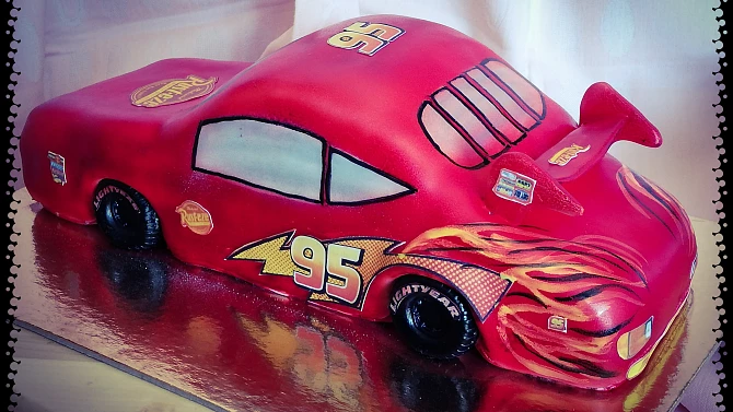 Vylijeme do vyššího plechu na pečící papír a pečeme na 160° cca 35 minut (zkusíme špejlí) Necháme na mřížce vychladnout. Krok 2: Korpus rozřízneme napůl a každou půlku rozřízneme podélně. Naskládáme na sebe a vykrojíme ostrým nožem tvar auta. Poté korpusy pokropíme buď bezovou šťávou nebo z černého rybízu a naneseme na každý díl krém z mascarpone a jednotlivé díly naskládáme na sebe. Zapravíme po obvodu tak, aby mascarpone krém nebyl po bocích auta a necháme v lednici aspoň hodinu odpočinout. Potom celý dort omažeme bílkovým krémem a necháme v lednici aspoň 2 hodiny zchladit Krok 3: Vyválíme potahový fondán a auto potáhneme. Nastříkáme airbrushem červenou barvou. Předtím však vystřihneme z papíru tvar oken, abychom je nezastříkali červenou barvou. Okna potom přejdeme šedou prachovku barvou. Vystřihneme znaky, přetřeme jemné vodou a přilepíme na fondán. Všechno ostatní domalujeme štětcem.