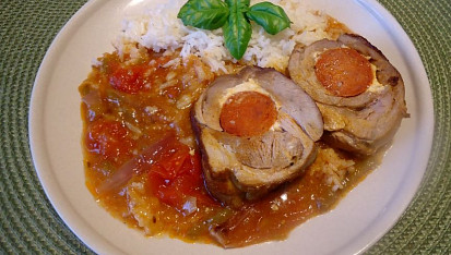 Z vykostěného stehna vytvoříme naříznutím plát, osolíme a okořeníme. Na připravený plát masa doprostřed rozetřeme sýr, přidáme klobásu a zavineme do rolky, kterou svážeme kuchyňským provázkem. Krok 2: Do rozpálené pánve dáme olej a rolku, osolenou a opepřenou i svrchu, opečeme ze všech stran a přendáme do zapékacího pekáčku. Ve výpeku v pánvi orestujeme cibuli nakrájenou na měsíčky, přidáme rozmáčknutý a nasekaný česnek, cherry rajčátka, krátce orestujeme a přendáme k rolce. Krok 3: Zalijeme vývarem, skleničkou leča, nebo můžeme dát čerstvé papriky a rajčata spařená a oloupaná (dávám i do leča). Vložíme zakryté do trouby na 60 minut, odklopíme a dopečeme bez zakrytí. Rolku vyndáme, zbavíme provázku, zakryjeme alobalem a necháme odpočinout. Po chvilce nakrájíme na širší plátky. Zatímco maso odpočívá, mírně zahustíme šťávu solamylem rozmíchaným ve lžíci vody.