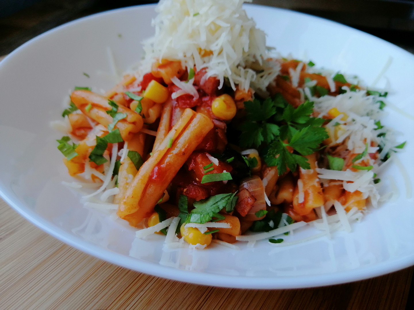 Krok 4: Do směsi přidáme uvařené těstoviny a promícháme. Na talíři podáváme s parmazánem a petrželkou na ozdobu.