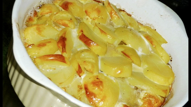Krok 3: Zapneme předehřívat troubu na 180-190 °C. Zapékací mísu vymažeme olejem, rozložíme do ní polovinu plátků brambor a posolíme je.