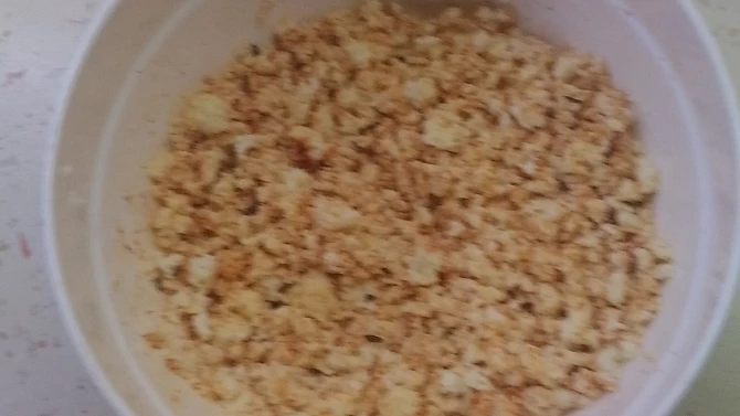Krok 2: Vzniklý tvaroh přendáme do misky a přidáme ostatní suroviny, v množství podle vlastního uvážení, soli trošku více. Tvaroh musí mít opravdu slanou chuť. Kdo má rád, přidá feferonku nebo čili. To lze přidat i do hotového sýru. Babička přetáhla plátýnko s gumičkou, speciálně k tomu účelu ušité. A proč? Aby tam nelezly mouchy. Já přetáhl perforovanou folií. Každý den promícháme. Necháme dva, možná tři dny na teplém místě, dokud "nezesýrovatí ", jo, jo, bude cítit. Čím déle, tím lépe, bude chutnější i voňavější. Chlebík k tomu nemá chybu. Gurmán dá na vršek ještě cibulku.