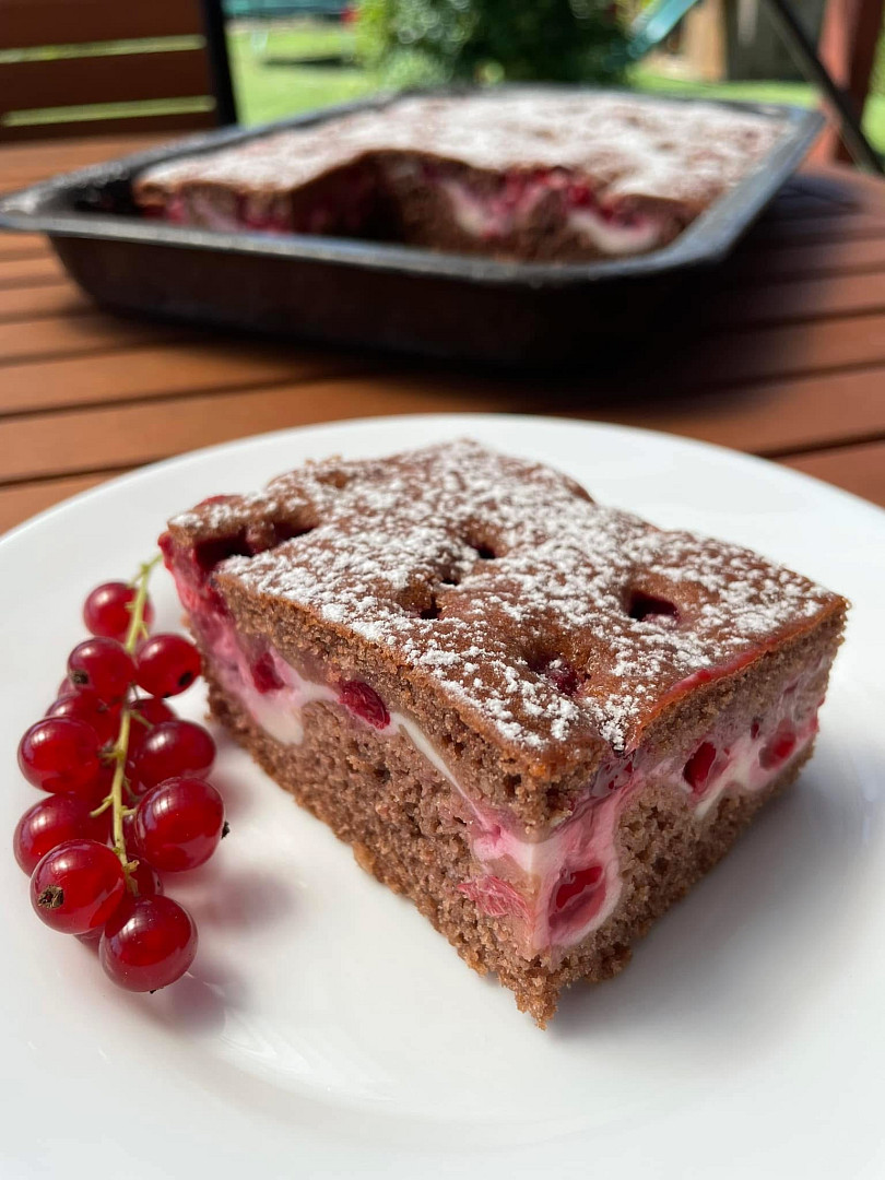 Hrníčkový kakaový koláč s tvarohem a rybízem