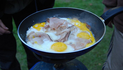 Krok 2: Poté rozklepneme na šunku vajíčka a necháme několik minut smažit, dokud bílky nebudou zcela tuhé. Podáváme okořeněné solí, pepřem s chlebem. Můžeme doplnit i o kečup.