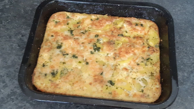 Papriku nakrájíme na tenké proužky a uložíme na cibuli. Na směs rozložíme druhou půlku brambor. Posypeme petrželovou natí, libečkem, posolíme a posypeme trochou Vegety. Vše ještě poklademe malými kousky másla. Krok 3: V nádobě vyšleháme vajíčka, přilijeme smetanu a promícháme. Brambory posypeme sýrem a malou naběračkou stejnoměrně polijeme vajíčkovou směsí. Krok 4: Dáme péct na 180°C. Zapékáme asi 20 minut zakryté (třeba alobalem), pak plech odkryjeme a dopečeme dorůžova.
