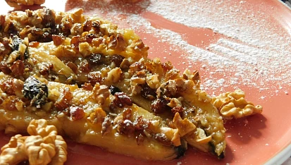 Krok 2: Vhodnou zapékací misku vytřeme lehce máslem. Banány rozkrojíme podélně a pokapeme citronovou šťávou. Lehce potřeme připraveným sirupem a posypeme směsí ořechů.