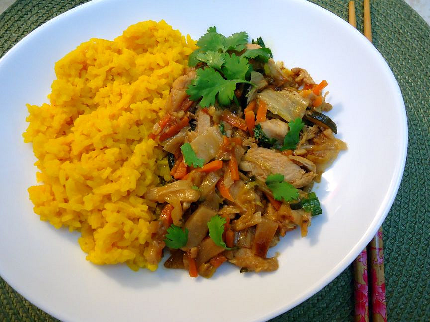 Krásně žlutá rýže a směs kuřecího masa se zeleninou potěší už na první pohled svou krásnou, barevnou kompozicí. A co teprve, až ji ochutnáte. Příprava není složitá a vaši strávníci si jistě velmi pochutnají.