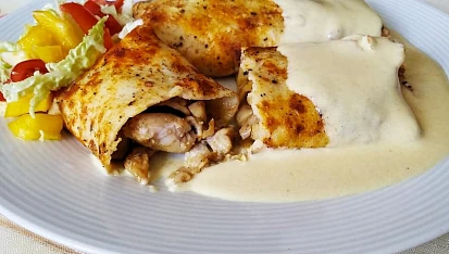 Pikantní palačinky plněné kuřecím masem se smetanovou omáčkou