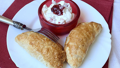 Plánujete slavnostní rodinný oběd a chcete ve svém menu překvapit něčím netradičním? Tak to jsou přesně tyto plněné šátečky. Listové těsto v sobě ukrývá kousek plísňového sýra, hrušku a ořech a jako dip poslouží šlehačka s brusinkami.