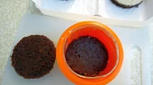 Krok 2: Dáme péct do vyhřáté trouby na 170 -180° C a pečeme cca 7-9 minut (hlídáme, každá trouba peče jinak, dort na 25-30 minut). Z vychladlého plátu pak vykrájíme vykrajovátkem o průměru 7-8 cm korpusy na dortíky. Vyjde 16 koleček z jednoho plechu o vnitřní velikosti 33 x33 cm. Připravíme si proužek silnější fólie (asi jako obal na spisy) široký podle výšky vykrajovátka a dlouhý jako jeho vnitřní obvod.