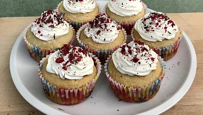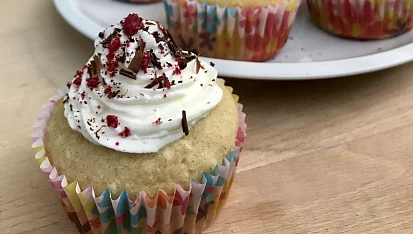 Krok 3: Následně pomocí lžičky vytvořte ve středu muffinů menší díru a naplňte malinovou náplní. V další míse vyšlehejte tvarohy s cukrem a pomocí zdobícího sáčku naneste na muffiny (cupcaky). Krém ozdobte čokoládou a lyofilizovanými malinami.