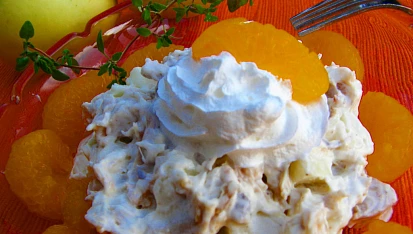 Krok 3: Na talířku salát ozdobíme kompotovanými mandarinkami.