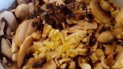 Krok 2: Do žampionové směsi, po vyndání vyvařené snítky tymiánu, přisypeme pokrájený Hermelín, Camembert či Olmín. Promícháme a necháme rozpustit. Vznikne nám vláčná krémová konzistence směsi, kterou budeme nanášet dle chuti na dozlatova osmažené topinky na sádle či oleji, okapané na ubrousku a potřené česnekem dle chuti.