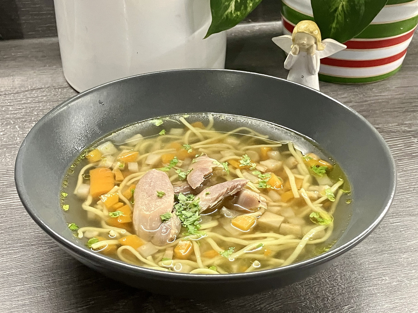 Začneme vodu pomalu zahřívat, dokud nedosáhneme bodu varu. Krok 3: Při dosažení varu se zaměříme, aby vývar neprobublával silně, ale jen tak zlehka. Zároveň odebíráme hromadící se sražené bílkoviny, tedy pěnu. Vaříme tak dlouho, dokud se pěna nepřestane tvořit. Krok 4: Pěna se přestala tvořit a my můžeme přidat očištěné kusy zeleniny (kromě petrželové natě). Nyní necháme vývar probublávat alespoň tři hodiny (dle potřeby přidáváme vodu do hrnce) a před koncem varu necháme chvíli povařit petrželovou nať. Krok 5: Jakmile jsme s vývarem spokojeni, připravíme druhý hrnec, do kterého vývar i s masem a zeleninou přecedíme přes jemné plátno. Krok 6: Zeleninu i maso vyjmeme z plátna na desku a necháme zchladnout. Poté mrkev nakrájíme na drobno, celer s petrželí na menší kostky a maso z kostí obereme a též pokrájíme. Krok 7: Všechny složky vrátíme zpět do vývaru, povaříme a dle chuti dosolíme.