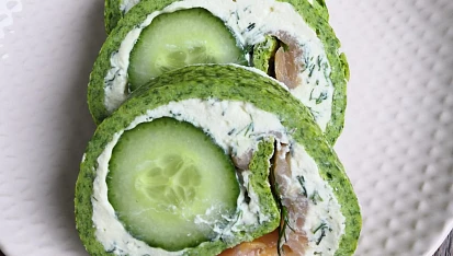 Krok 2: Smícháme ricottu, kopr, sůl, pepř, hořčici a šťávu z citronu. Natřeme na vychladlou placku, přidáme okurku, lososa a zarolujeme.