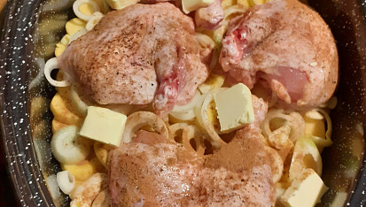 Krok 1: Kurča rozdelíme na porcie, posolíme ich a posypeme škoricou. Zemiaky a cibuľu nakrájame na kolieska, cesnak na plátky.