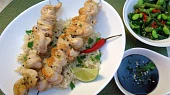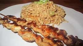Kuřecí satay s hnědou rýží a tmavou arašídovou omáčkou