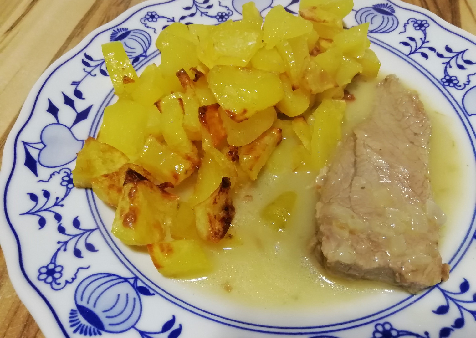 Krok 2: Na sádle zpěníme cibulku nadrobno pokrájenou, přidáme plátky masa a drcený pepř. Chvilku dusíme, podléváme polévkou a posléze zahustíme rozmíchanou vodou s moukou. Provaříme.