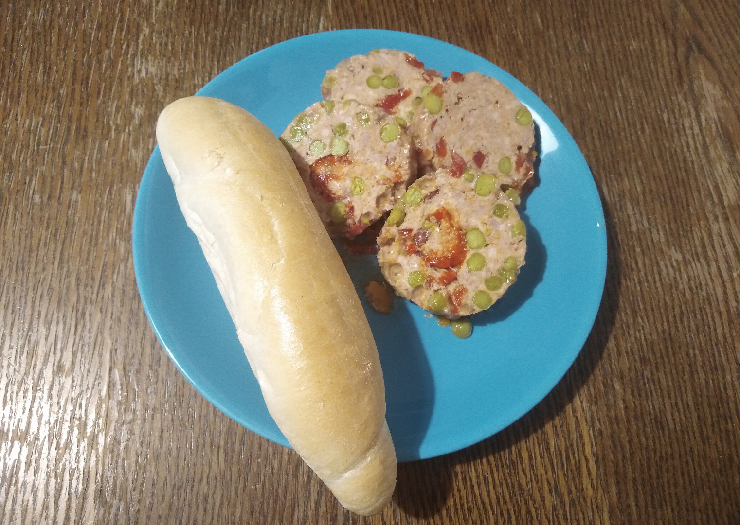 Krok 1: Maso nameleme nadrubo a dáme do misky. Přidáme všechno sypké koření a vodu. Důkladně promícháme, aby se vše krásně propojilo. Poté přidáme sterilovanou červenou papriku a mražený hrášek a zase znovu důkladně promícháme. Pak dáme na hodinu odležet do lednice.