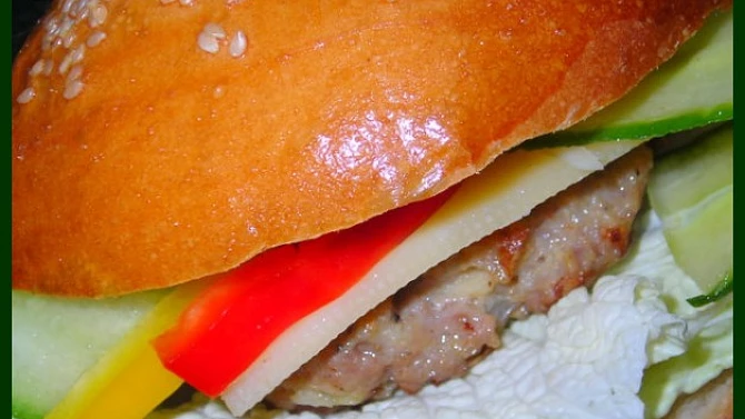 Krok 3: Na spodní část dáme list salátu, na něj teplé maso, plátek tvrdého sýra a zeleninu (řezy papriky, okurky, někdo dává okurku kyselou). Přiklopíme a ihned podáváme.