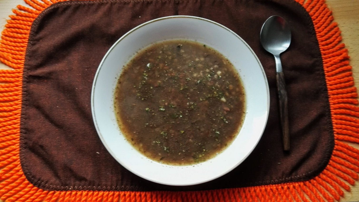 Krok 2: Na sádle usmažíme cibulku dorůžova, přidáme trochu vody a do ní rozředíme (rozkvedláme) vymačkaná krvavá jelítka. Přidáme vepřový vývar, uvařené kroupy a krátce povaříme.