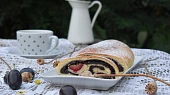 Krok 5: Z vykynutého těsta vyválejte obdélník, potřete jej makovou náplní, naskládejte půlky švestek a zaviňte.