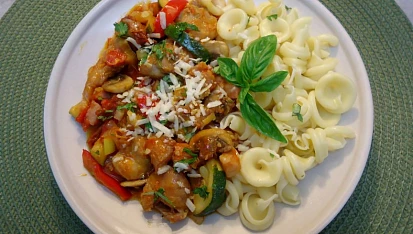 Krásné letní dny trávíme raději venku a k vaření vybíráme raději recepty rychlé na přípravu. Kuřecí kousky se spoustou zeleniny a bylinek jsou toho důkazem. Nastrouhaný parmezán svojí typickou chutí a vůní doladí toho skvělé jídlo.